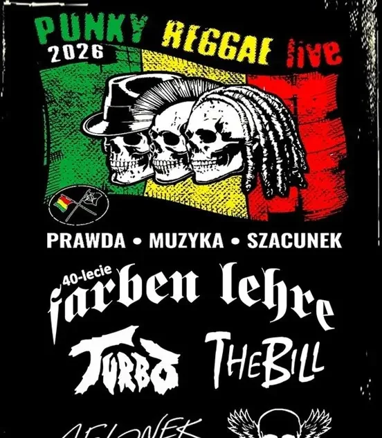 Zwolenników pozytywnych wibracji, dobrej zabawy, melodyjnego grania oraz szczerych dźwięków, czeka iście wytrawna uczta koncertowa, a to za sprawą kolejnej edycji trasy PUNKY REGGAE live 2026, która tradycyjnie odbędzie się od połowy lutego do końca kwietnia. Będzie to również świetna okazja do świętowania jubileuszu 40-lecia istnienia gospodarza trasy, płockiego zespołu FARBEN LEHRE, który specjalnie na tę okoliczność przygotowuje specjalną, urodzinową setlistę, pełną rozmaitych niespodzianek, tudzież kilku miłych zaskoczeń. Zgodnie z wieloletnią tradycją PRlive, w rolach głównych, na większości koncertów pojawią się dwie kapele: bezkompromisowa, zawsze czujna zwarta i gotowa załoga the ANALOGS oraz młode wilki, skutecznie przecierające koncertowe szlaki, czyli zarażająca radością grania formacja PULL THE WIRE. Melodyjny, a do tego energetyczny punk-rock i brawura, przyprawione szczyptą pozytywnych wibracji w klimatach punky-reggae-party – oto muzycznie menu, jakie zaserwują wszystkie zespoły, grające na PUNKY REGGAE live 2026. Jak co roku, na scenie pojawi się również kilka interesujących ekip, w charakterze gości-supportów, m.in. De Łindows, Stacja B. czy reaktywowana tylko na kilka okazjonalnych koncertów, płocka kapela STRAJK. Wzorem poprzednich edycji, tym razem w trzech miastach (Warszawa, Wrocław & Kraków) na scenie pojawi się łącznie 6 zespołów, a wśród nich tak zacne podmioty jak The Bill, Zenek Grabowski, Closterkeller czy debiutujące na PRlive grupy Turbo, Jelonek czy Hamulec.